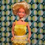 Picnic Pretty Barbie looks cute in a darling day dress. Her Country style outfit evokes the fresh spring-summer air. She wears a pink halter bodysuit with a yellow bow at the neckline. Her wide high waist skirt gives her a very feminine touch, in yellow and white gingham fabric with pink and white trim. The little purse matches her skirt perfectly! But, the cutest thing in her outfit is that pretty white hat with pink flowers. I really love it! Doesn’t she look beautiful in the sunlight?
